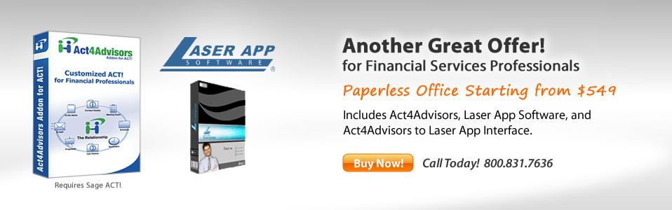 Act4Advisors utilizes the most popular contact management system, ACT!. ACT! has excellent features and is one of the easiest to use contact management systems on the market. Act4Advisors simply customizes ACT! for a financial services practice. Act4Advisors enables you to organize prospect and client data and stay on top of activities to keep pace with your demanding schedule. Act4Advisors Addon for ACT! is designed specifically for financial services professionals.